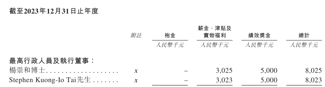 在这期间,除杨崇和、Stephen Tai之外,其余所有董事的年薪都没有超过120万元,于报告期内,单一董事的总薪酬均不超过300万元。