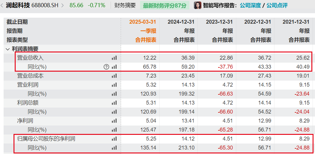 从2024年开始,公司业绩又重回增长轨道,并持续至今。澜起科技预计,2025年上半年实现营收约26.33亿元,同比增长58.17%;归母净利润11亿元至12亿元,同比增长85.50%~102.36%。