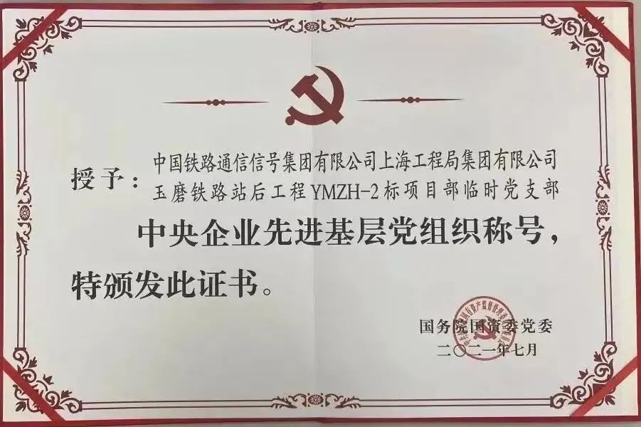 中国通号玉磨铁路项目党支部始终坚持党建引领,扎实开展党史学习教育,不断增强基层党组织战斗堡垒作用、党员先锋模范作用和青年突击队生力军作用,形成“抓党建、带队伍、促建设”的整体合力,将在党史学习教育过程中激发出来的信念斗志,转化为项目建设的实际行动,全面贯彻落实业主单位和中国通号党委关于中老铁路的建设要求,协力创建“平安玉磨、精益玉磨、廉洁玉磨、生态玉磨、绿色玉磨”。2021年7月,凭借高质量的项目党建品牌建设,中国通号上海工程局集团玉磨铁路站后工程YMZH—2标项目临时党支部荣获“中央企业先进基层党组织”荣誉称号。