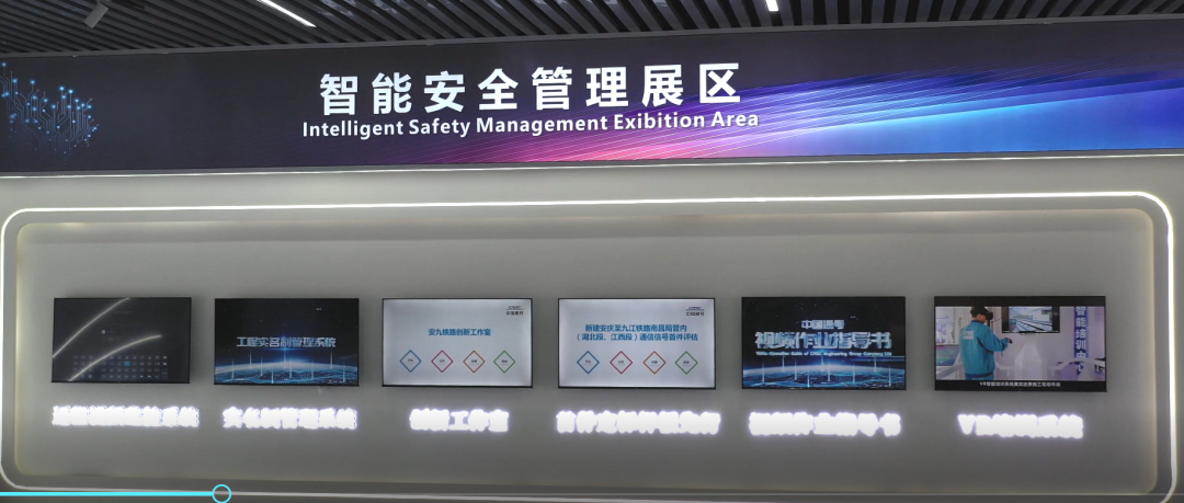 智能安全管理展区:集中展示远程视频监控系统、实名制管理系统、创新工作室、首件定标样板先行、视频作业指导书、VR培训系统等6项智能安全管理手段。