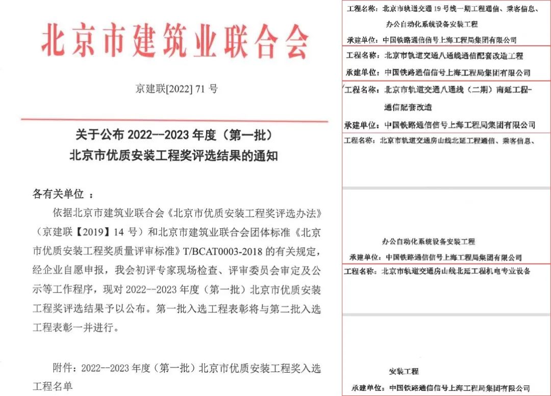 奋进新征程,建功新时代!中国通号精益工程建设再传捷报。近日,北京市建筑业联合会公布了2022-2023年度北京市优质安装工程奖评选结果,上海工程局集团负责的北京市轨道交通19号线一期工程通信、乘客信息、办公自动化系统设备安装工程、北京市轨道交通八通线通信配套改造工程、北京市轨道交通八通线(二期)南延工程-通信配套改造工程、北京市轨道交通房山线北延工程通信、乘客信息、办公自动化系统设备安装工程、北京市轨道交通房山线北延工程机电专业设备安装工程荣获2022-2023年度“北京市优质安装工程奖”。