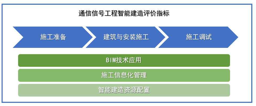 通信信号工程智能建造等级的评价指标包含6类分项指标:施工准备、建筑与安装施工、施工调试、BIM技术应用、施工信息化管理、智能建造资源配置。