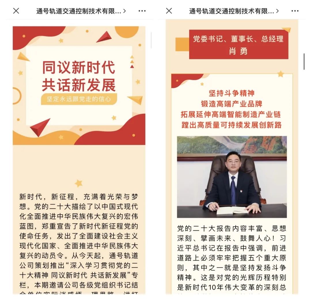 通号轨道开设“深入学习贯彻党的二十大精神同议新时代共话新发展”专栏,各级党组织书记结合单位实际谈感悟、理思路、讲打算、话发展,以真学真用推动党的二十大各项决策部署在企业落实落地。