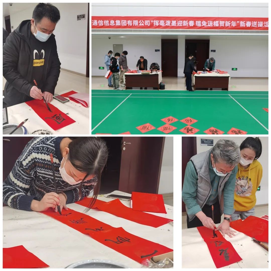 为大力弘扬中国传统文化,营造欢乐祥和的节日氛围,通信信息集团工会开展“挥毫泼墨迎新春,瑞兔送福贺新年”新春送福活动。在春联书写现场,长桌排开,红纸铺就,书法爱好者们尽情挥毫泼墨,笔走龙蛇,把对美好生活的礼赞融入春联,一副副散发着清新墨香的春联随笔而生。