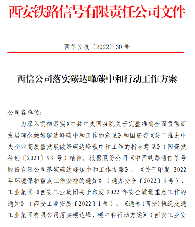党的二十大报告指出,实施产业基础再造工程和重大技术装备攻关工程,支持专精特新企业发展,推动制造业高端化、智能化、绿色化发展;推动经济社会发展绿色化、低碳化是实现高质量发展的关键环节。中国通号作为肩负社会责任的中央企业,始终践行绿色发展理念,将节能减碳和环境保护融入公司治理,为国家可持续发展战略作出积极贡献。