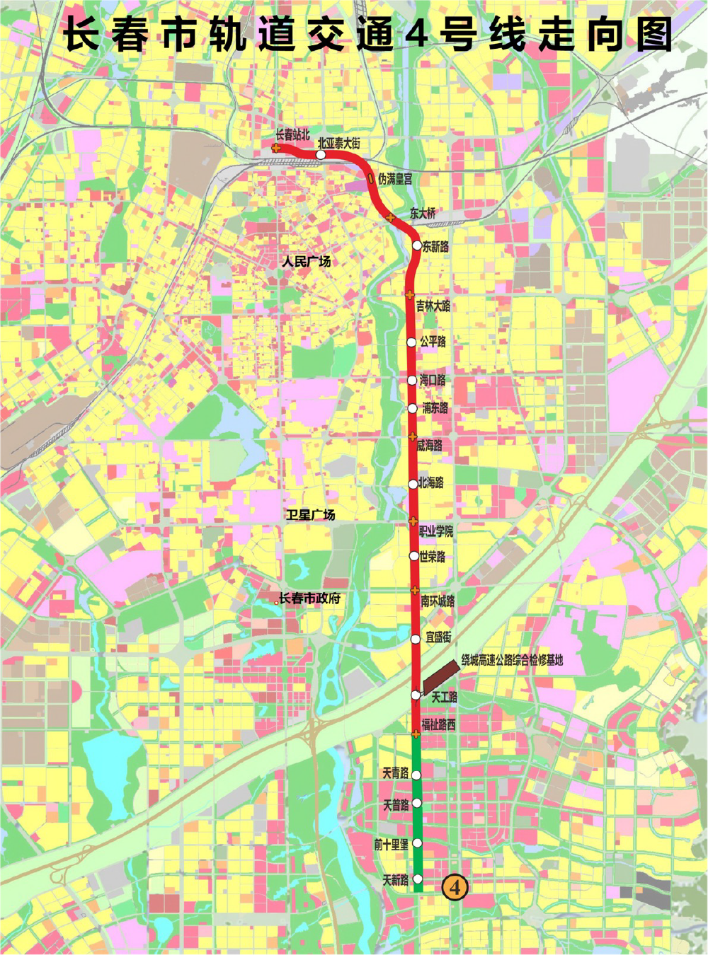 长春4号线北起长春站北站,南至天新路站,跨越长春市宽城区、二道区、南关区,途经长春站北广场、伪满皇宫博物院、东大桥、长春市第六中学、长春海关、长春职业技术学院等多处人流量较大的位置,线路呈南北走向。本次开通包含南延线及既有线信号系统升级改造部分,开通后线路全长20.8公里,车站增加至21座,可以更快实现与1号线、2号线、3号线快速换乘。长春4号线是连接城市南北的轨道交通主干线,南延线的开通运营为天河路和临河街交汇区域以及临河街往南的居民提供了极大的交通便利,有效分担了线域内交通压力。