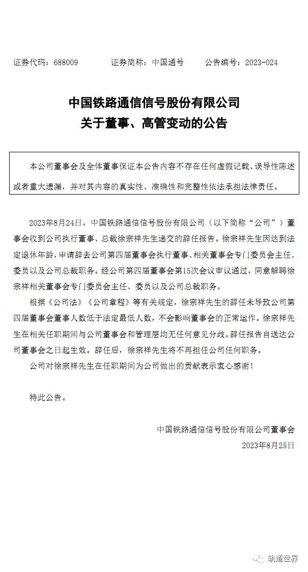 2023年8月24日,中国铁路通信信号股份有限公司董事会收到公司执行董事、总裁徐宗祥先生递交的辞任报告。