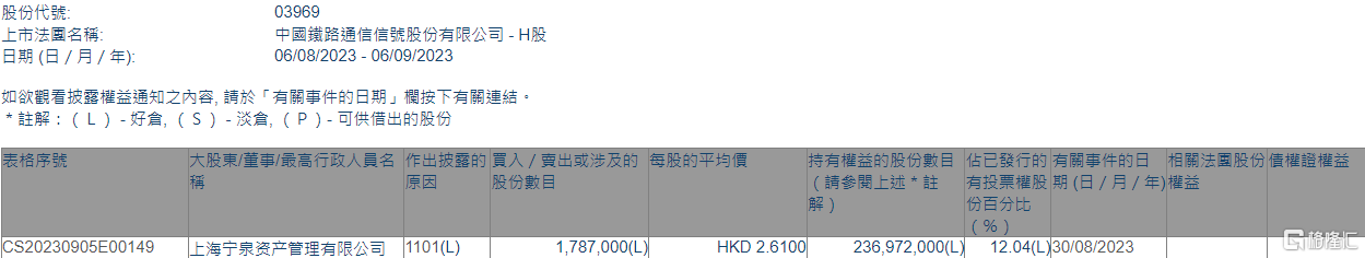 格隆汇9月6日丨根据联交所最新权益披露资料显示,2023年8月30日,中国通号(03969.HK)获上海宁泉资产管理有限公司在场内以每股均价2.61港元增持178.7万股,涉资约466.41万港元。