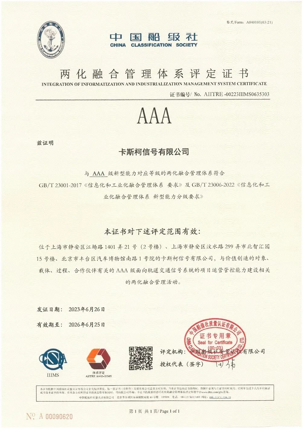 作为企业数字化转型变革的先行者,卡斯柯公司于2016年6月,获得工信部“两化融合管理体系贯标评定证书”,两化融合收获了初步的成果,同时也拉开了公司从“信息化建设”到“数字化建设”转型的序幕。2021年,卡斯柯公司数字化转型工作全面开启,并制定了两化融合工作目标。2022年,卡斯柯公司开启了两化融合管理体系2.0升级贯标工作,经过严格的评审流程,最终获得AAA级证书,这也是目前认证中能申请到的最高级别。