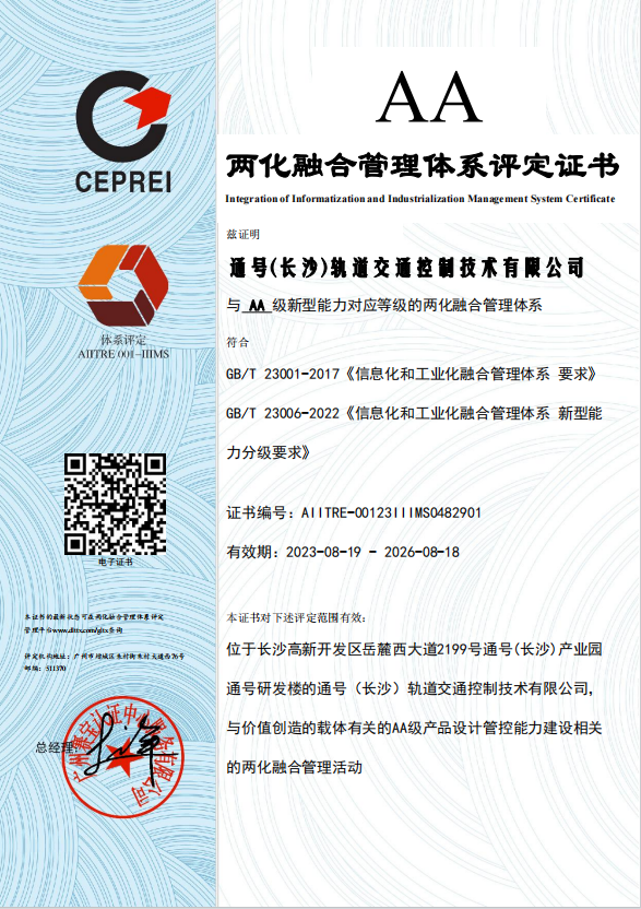 通号轨道公司于2022年6月份启动两化融合管理体系贯标认证工作,通过组织分析企业现状及评估战略、优势、能力,确定了初次评定越过初级认证直接申报AA级新型能力建设认证的目标,并稳步推进。2023年8月,通号轨道公司顺利通过两化融合管理体系2.0的评定并一次获得AA级证书。