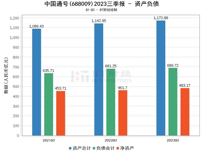 从资产负债方面看,中国通号2023年三季度末的总资产为1172.88亿元,相比上年度末的1168.07亿元略有增加。负债合计为689.72亿元,较上年度末的695.29亿元有所下降。净资产为483.17亿元,较上年度末的472.78亿元有所增加。资产负债率为58.81%,较上年度末的59.52%有所下降。