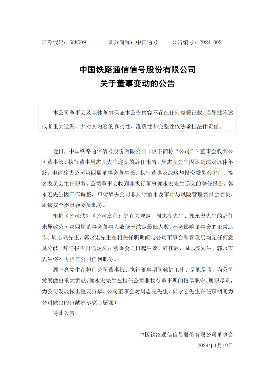 中国通号(688009)于1月18日发布晚间公告称,近日,中国铁路通信信号股份有限公司(以下简称“公司”)董事会收到公司董事长、执行董事周志亮先生递交的辞任报告。周志亮先生因达到法定退休年龄,申请辞去公司第四届董事会董事长、执行董事及战略与投资委员会主任、提名委员会主任职务。公司董事会收到非执行董事郭永宏先生递交的辞任报告。郭永宏先生因工作调整,申请辞去公司非执行董事及审计与风险管理委员会委员、质量安全委员会委员职务。