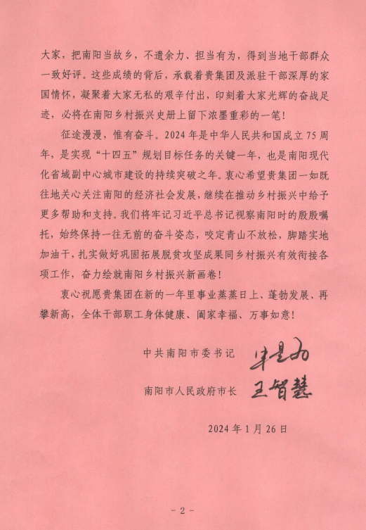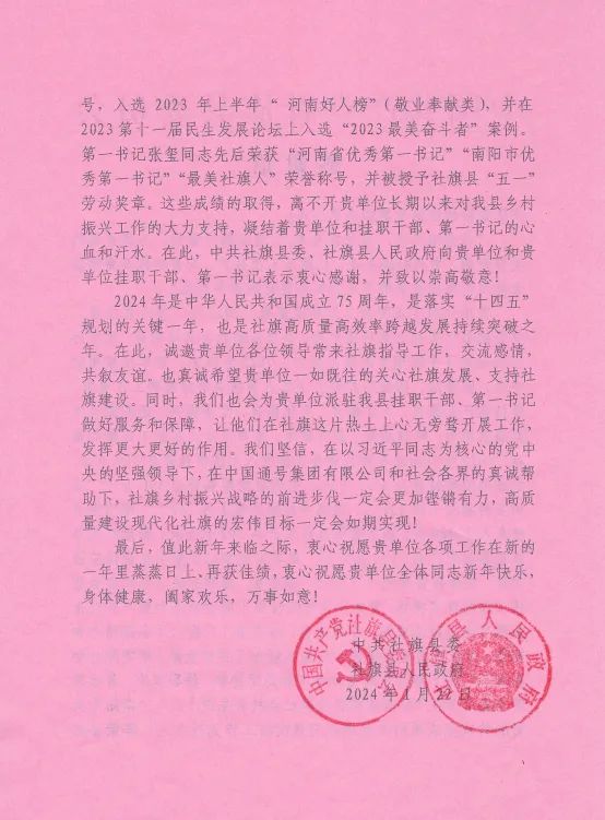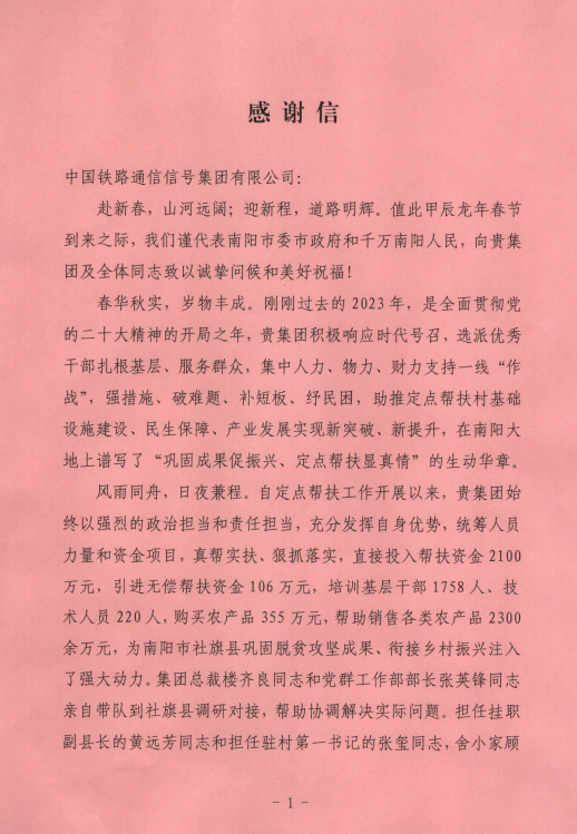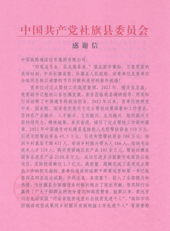 春节临近,河南省南阳市委、南阳市人民政府,社旗县委、社旗县人民政府先后发来感谢信,对中国通号全体同志致以诚挚的节日问候和新春祝福,对中国通号长期以来对社旗的关心和支持表示感谢,对中国通号挂职干部的优良作风和积极贡献表示肯定。