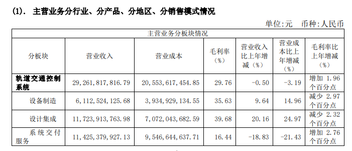 公司主营为轨道交通控制系统、设计集成、系统交付服务、设备制造、工程总承包、其他业务、其他,占比为90.58%、48.38%、19.54%、22.65%、8.07%、0.88%、0.47%,分别实现营收292.62亿元、117.24亿元、114.25亿元、61.13亿元、76.74亿元、8519.25万元、6676.37万元,毛利率分别为29.76%、39.68%、16.44%、35.63%、10.11%、99.06%、68.36%。