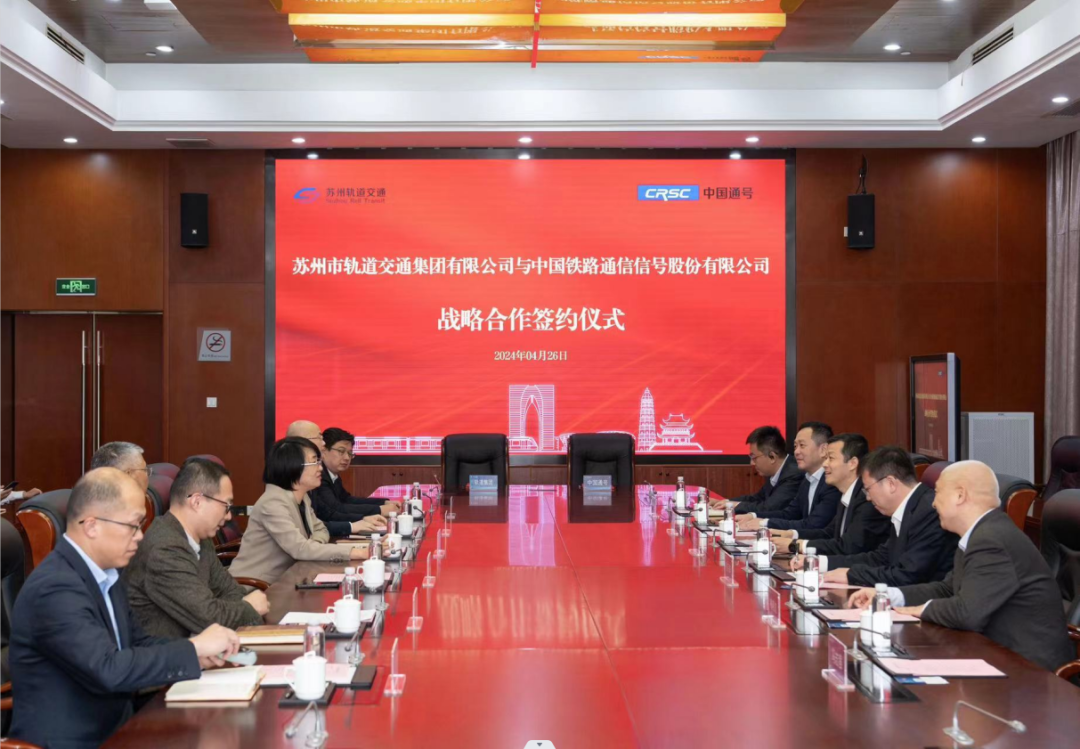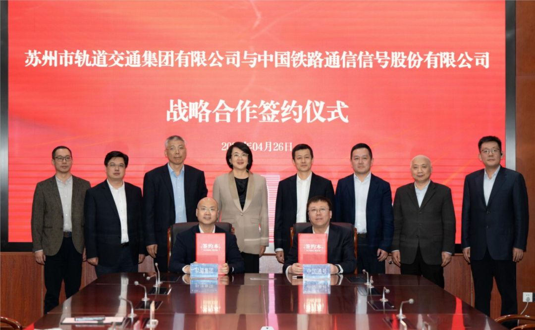 近日,苏州市轨道交通集团有限公司(以下简称“轨道集团”)与中国铁路通信信号股份有限公司(以下简称“中国通号”)签署了战略合作协议。轨道集团党委书记、董事长金铭,集团党委副书记、总经理陆文学,中国通号党委常委、副总裁、总工程师张志辉,创新部部长徐宗奇出席签约活动。