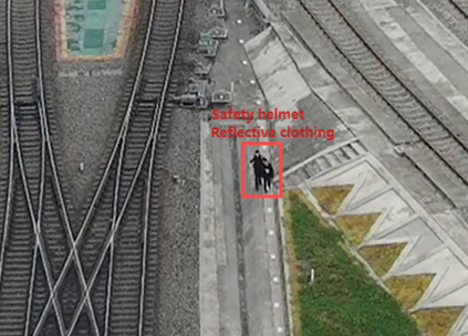 成都北编组站为半封闭场站,外来人员管控难度较大,通常需要安防人员发现入侵后立即赶往监测点对其进行驱离。铁路编组站无人机智能巡检平台可在编组站区域设定周期巡视航线任务,无需人员操控,无人机不受白天黑夜限制按周期任务进行自动巡视,通过对人员的服装、头饰进行AI识别,对外来人员以及未正确佩戴安全帽、反光服的工作人员进行抓拍记录并通过喊话照明一体机进行报警驱离、安全提示。另外,巡检系统对工务和电务场站内的重要检修作业提供安全防护,无人机可指定飞行至作业区域,对全过程进行跟踪监控,实现全站场各专业间的安全互保互助。