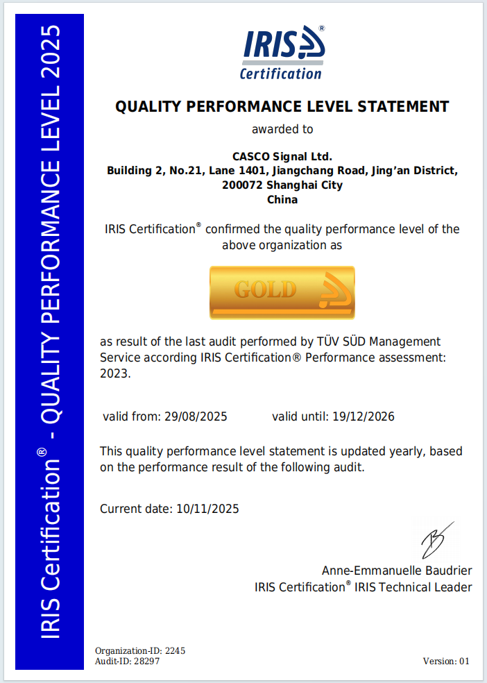 近日, 中国通号 卡斯柯成功通过国际铁路行业标准(IRIS)审核,正式获颁IRIS最高绩效等级金级证书,成为全球铁路信号行业首家获此殊荣的企业。这一突破标志着 中国通号 卡斯柯在质量管理领域已达到国际领先水平,为中国轨道交通产业高质量发展树立了全新标杆。