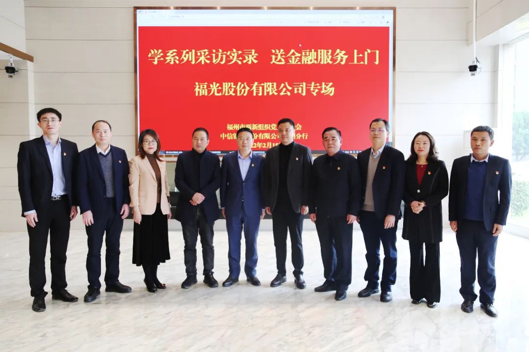 福州市两新组织党建促进会和中信银行福州分行联合开展的“走进我市百家非公企业——学系列采访实录送金融服务上门”首站活动走进福建福光股份有限公司。福州市委非公企业和社会组织工委专职副书记陈有飞,市两新组织党建促进会常务副会长郭荣贵,中信银行福州分行党委书记、行长姜雨林,福光股份党委书记、董事长何文波以及福光股份党员、职工代表等60多人参加本次活动。