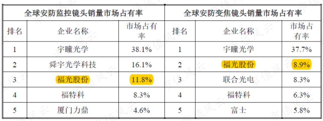 2017年,福光股份在全球安防视频监控镜头领域的市占率为11.8%,全球排名第三,其中,变焦镜头的市占率约为8.9%,全球排名第二。