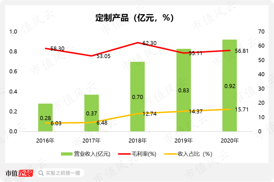 军用定制产品用来撑门面,非定制民用产品则贡献了福光股份绝大部分的营业收入:2020年,非定制产品带来了4.16亿元的营收,营收占比为71.21%。