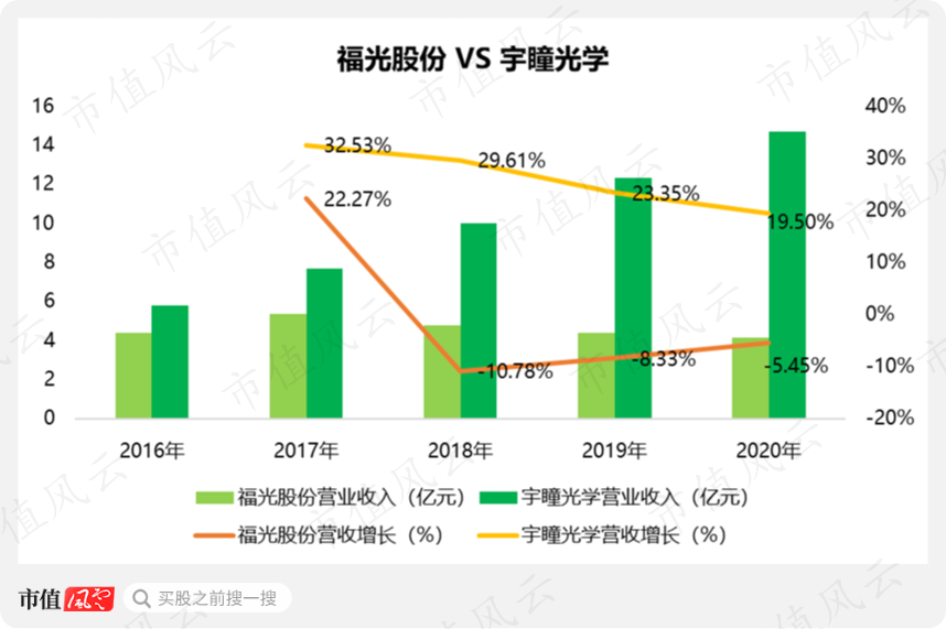 不过,军用定制产品相较民用来说,毕竟市场较小,对福光股份来说,也只适合用来吹吹牛皮,并不能构成其营收的源泉:2016年至2020年,福光股份军用定制产品的营收占比虽逐年递增,但到2020年,其营收占比也不过15.71%,给福光股份带来了0.92亿元的营收。