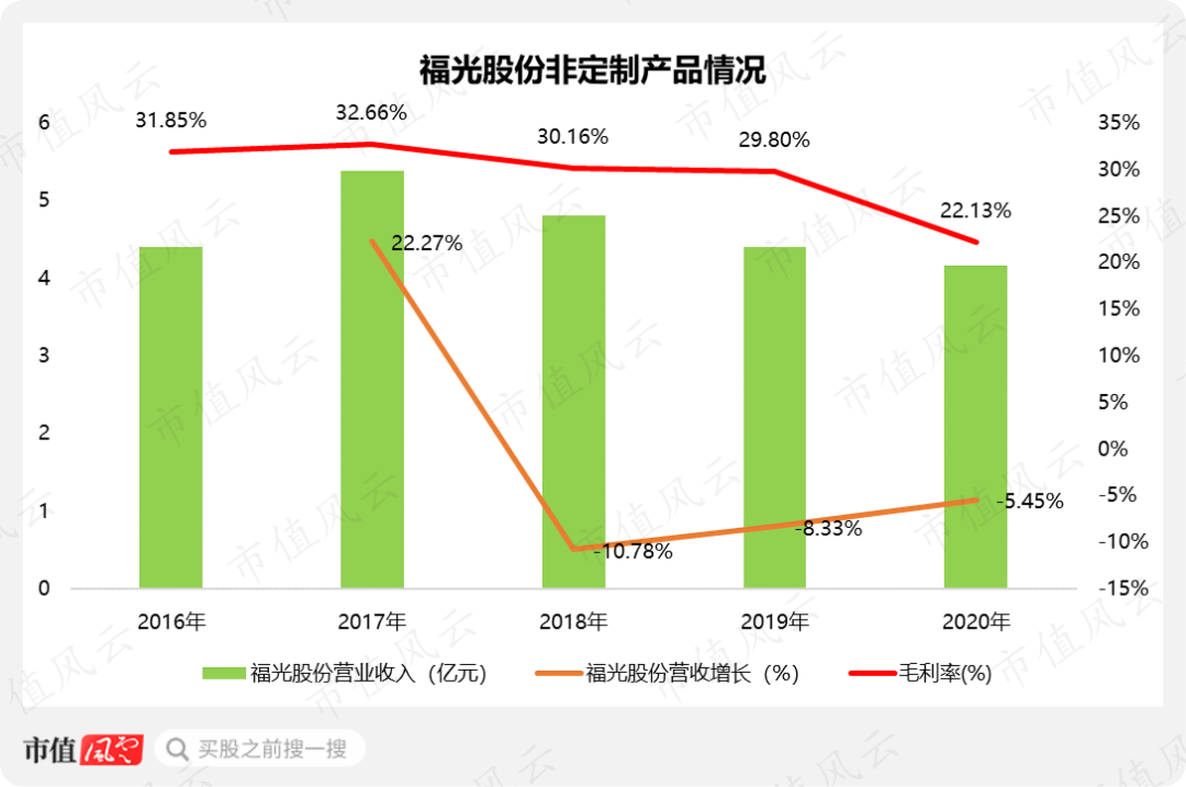 但是,2017年之后,福光股份的非定制产品却迎来连续三年的营收负增长,同时伴随着毛利率水平的下降,可谓是双重打击。