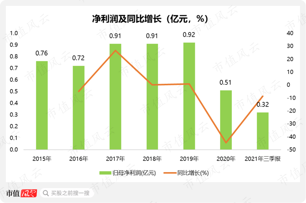 2020年,即福光股份上市后的次年,其归母净利润直接上演变脸,仅实现0.51亿元,同比下降44.64%,几近腰斩。2021年前三季度实现归母净利润0.32亿元。