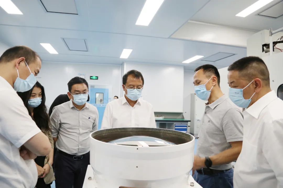 在超精密实验室,一行人察看公司生产车间、产品工艺,观看公司员工操作设备的过程,了解技术研发、生产制造情况。尖端设备和前沿技术让考察组成员赞叹不已。