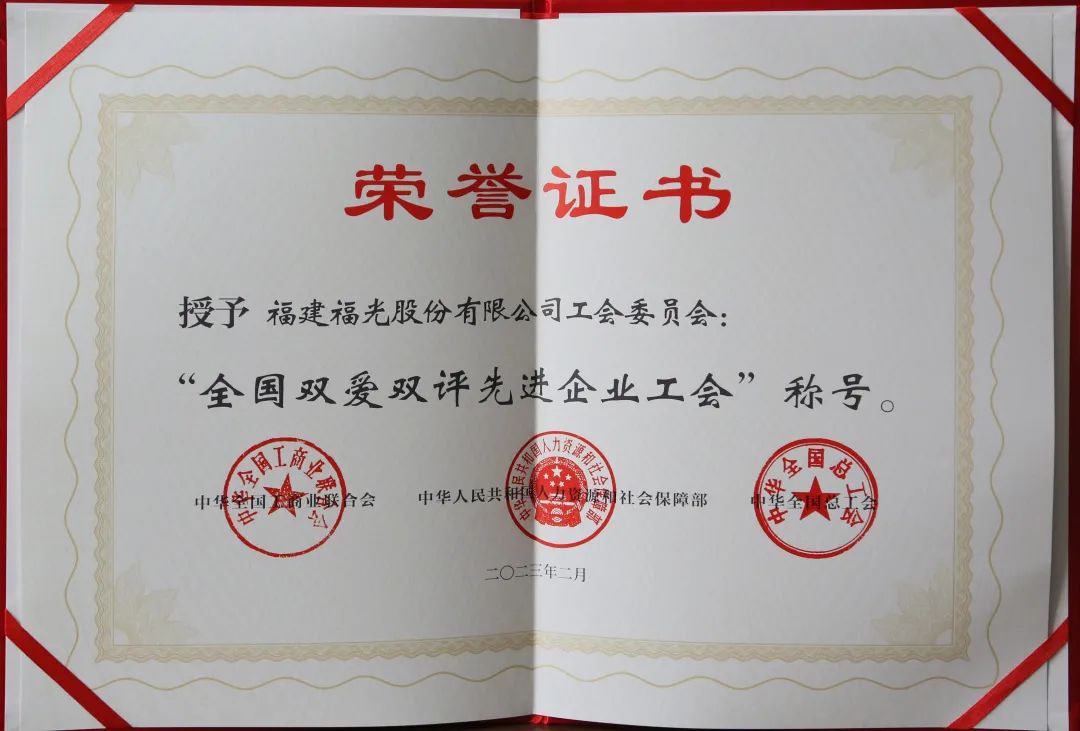 2月21日,全国工商联、人力资源和社会保障部、全国总工会联合召开全国就业与社会保障先进民营企业暨关爱员工实现双赢表彰大会。会上,福建福光股份有限公司工会委员会荣获“全国双爱双评先进企业工会”荣誉称号,是福建省唯一一家获此殊荣的企业工会。