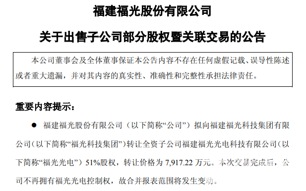 12月12日晚间, 福光股份 (688010)公告,公司拟向 福建福光科技集团有限公司 (以下简称“福光科技集团”)转让全资子公司 福建福光光电科技有限公司 (以下简称“福光光电”)51%股权,转让价格为7,917.22万元。本次交易完成后,公司不再拥有福光光电控制权,故合并报表范围将发生变动。