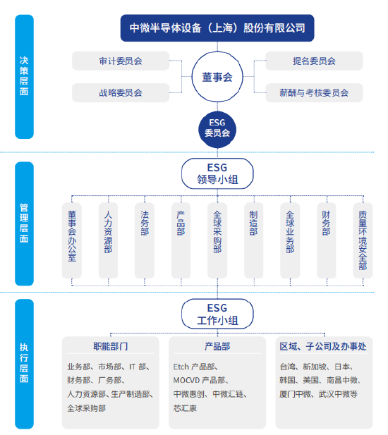 作为一家首次进行ESG信息披露的公司,中微公司便已经建立了一套涵盖“决策层-管理层-执行层”的ESG治理架构,并且确立了董事会的三大ESG责任,即强化 ESG 事宜监督、明确 ESG 战略方针、ESG 目标落实。