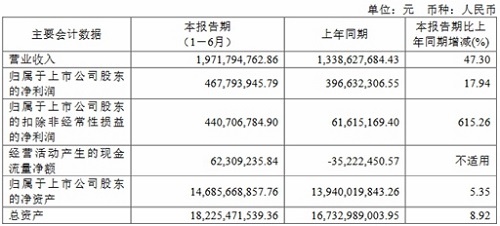 根据公告内容,中微公司上半年实现营收19.72亿元,同比增长47.3%;归属于上市公司股东的净利润为4.68亿元,同比增长17.94%;归属于上市公司股东的扣非净利润为4.41亿元,同比增长615.26%。