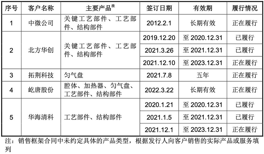 先锋精科产品获得主要客户高度认可,腔体、内衬、加热器、匀气盘等关键工艺部件是主要客户刻蚀设备及薄膜沉积设备的重要供应商。报告期内,其重大产品销售合同具体情况如下: