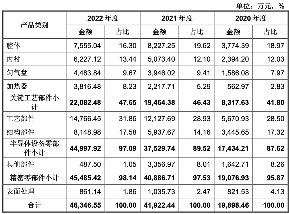 该公司形成了关键工艺部件、工艺部件、结构部件三大类主要产品,重点应用于刻蚀设备和薄膜沉积设备等半导体核心设备中。在刻蚀领域,先锋精科主要提供以反应腔室、内衬为主的系列核心配套件;在薄膜沉积领域,先锋精科主要提供加热器、匀气盘等核心零部件及配套产品。