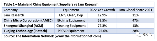 值得一提的是,根据The Information Network在SeekingAlpha发布的报告显示,三家与泛林集团(Lam)直接竞争的中国大陆公司中(中微公司AMEC、盛美上海ACM、拓荆科技Piotech),2021年泛林虽然占据刻蚀设备市场 47%的份额,占据清洁设备市场 13%的份额,占据薄膜沉积设备PECVD市场 28%的份额,但泛林2022年收入增速同比增长为12.9%,低于刻蚀设备竞争对手中微12.9%、清洁设备竞争对手盛美上海77.3%、薄膜沉积设备PECVD拓荆科技77.3%的增速,这表明泛林相应的份额受到了侵蚀。
