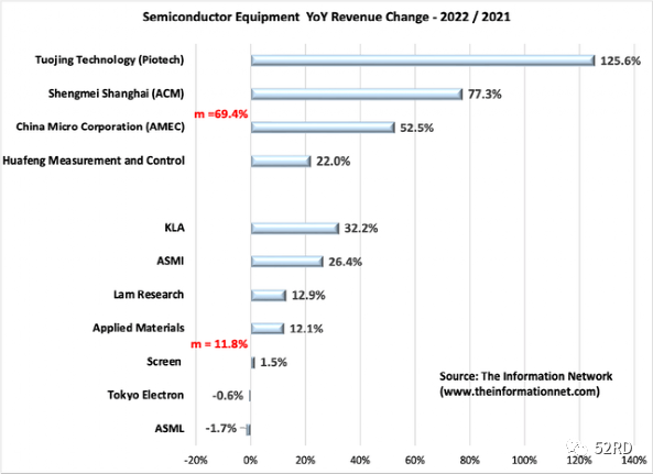此外,中国四家半导体设备厂商(中微、盛美上海、拓荆科技、华峰测控)2022年收入平均增速为69.4%,接近于非中国半导体设备厂商11.8%增长率的近6倍,表明中国半导体设备厂商虽然收入低于非中国同行,但正在获得更多的市场份额。