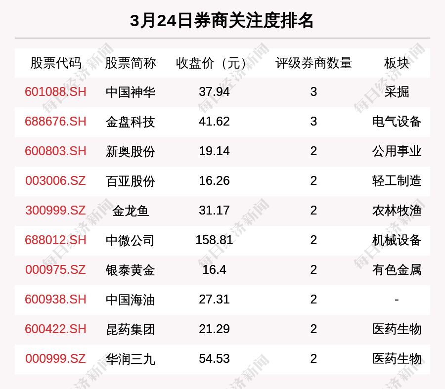 从券商对个股的关注程度来看,有13只个股获得多家券商关注,券商关注数量排名居前的个股是中国神华(601088.SH)、金盘科技(688676.SH)、新奥股份(600803.SH)。
