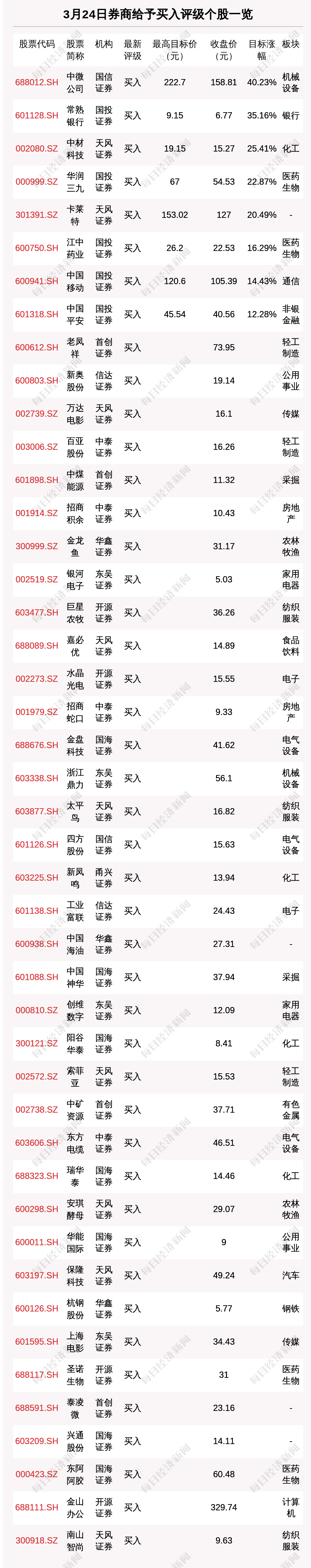 每经AI快讯,3月24日,券商给予评级的个股数共有57只,获得买入评级的个股数共有45只。在公布了目标价格的8只个股中,按照最新收盘价计算,预期涨幅排名居前的个股是中微公司(688012.SH)、常熟银行(601128.SH)、中材科技(002080.SZ),预期涨幅分别是40.23%、35.16%、25.41%。