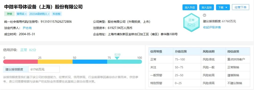另外,我们根据AI风险管理系统RiskRaider风险雷达对“中微半导体设备(上海)股份有限公司”的风险评估,AI的评分如下: