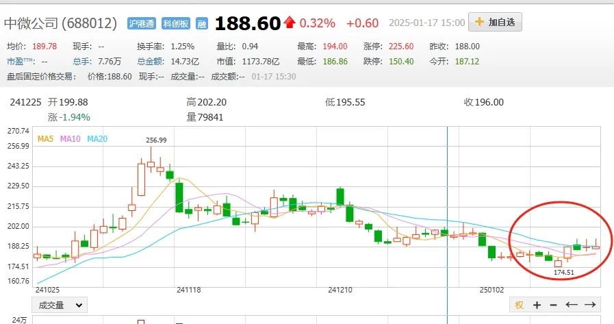 对于半导体企业而言,持续投入的技术创新是核心竞争力之一,这家公司在A股上市,其市值目前仅次于行业里的巨头北方华创,在2025年1月17日,它在A股的收盘价格为188.6元人民币,价格正在企微,有待涨出新的增长趋势,被聪明资金普遍看好。