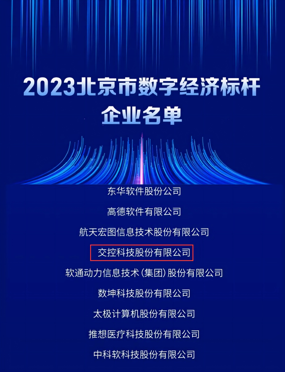 2月29日,2023北京市数字经济标杆企业评价报告发布会在北京数据基础制度先行区召开,发布会由北京市经济和信息化局指导,北京软件和信息服务业协会、北京市数字经济促进中心、中国信息通信研究院和德勤中国共同主办,交控科技经过提名推荐、补充推荐、审查评价等严格流程,凭借其杰出表现,荣获北京市数字经济标杆企业殊荣。