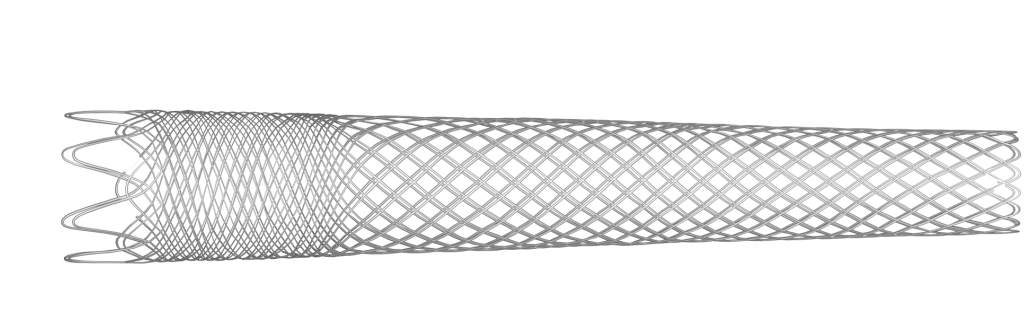 1)支架采用疏密网孔相结合的一体化设计,使其兼具足够的支撑力和优异的柔顺性,这种“刚柔并济”的特点,既解决了髂股静脉受压的问题,又顺应了静脉血管生理性弯曲的特性;