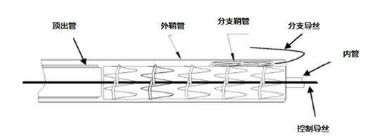 分支型覆膜支架是由一个主体支架和一个或多个分支支架组合而成。根据是否需要在体内用多个部件组装成型,可以分为一体分支型覆膜支架和模块分支型覆膜支架。在分支型覆膜支架释放时,主体支架置入主动脉弓中,分支置入主动脉弓部的分支动脉中。从结构上看,分支型覆膜支架不仅可以治疗累及升主动脉和主动脉弓的病变,而且可以取代目前实践中使用的治疗降主动脉病变的覆膜支架,不仅能够克服现有覆膜支架的部分弱点,而且还降低手术并发症,使治疗更为安全和可靠。