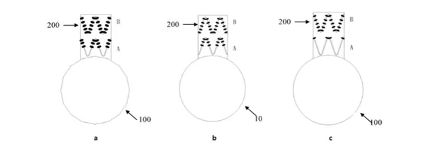 该专利涉及一种一体分支型覆膜支架,这类支架在输送过程中需要安装到输送系统的外鞘管中,由于支架本身的分支结构,需将分支折向近端与主体支架平行,以便将覆膜支架整体装入外鞘管中,如下图所示。因此,为了便于分支的折叠和释放,在该专利之前的现有技术中,分支型覆膜支架会在分支的支架段与主体支架之间存在数毫米的没有支架的覆膜段。该覆膜段由于缺乏支架的支撑,力学强度不足,在置入病变部位后容易造成管腔狭窄或者堵塞。针对现有技术中的这一问题,该专利对一体分支型覆膜支架的结构进行了改进。