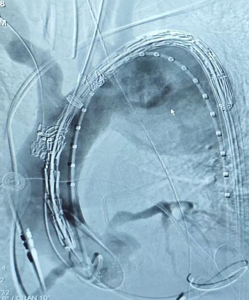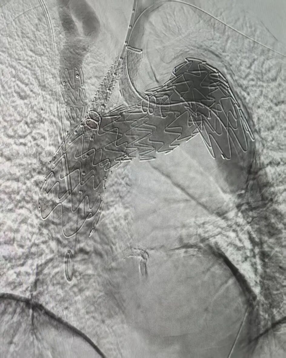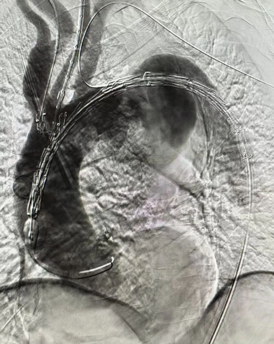 马来西亚病例手术在诺灯心血管医院(Northern Heart Hospital Penang)由Edward Choke教授及其团队实施。该患者诊断为累及左颈总动脉的弓上动脉瘤,瘤体直径达6.5cm,弓部小弯侧无适合常规支架的健康锚定区。为确保瘤体有效隔绝,需将覆膜支架近端锚定区前移至升主动脉,并重建弓上三分支。手术团队经综合评估,确认Hector?/通天戟?胸主多分支支架能够在单次腔内手术中实现全部治疗目标。术中,Hector?/通天戟?胸主多分支支架主体被精确定位并顺利展开,随后左颈总动脉分支在支架下沉区预留的空间内顺利完成超选,左锁骨下动脉分支在预埋导管的辅助下也成功完成导丝通道建立和桥接支架释放。整个手术过程顺利,未发生术中并发症,术后造影显示动脉瘤隔绝效果良好,分支血管血流通畅。