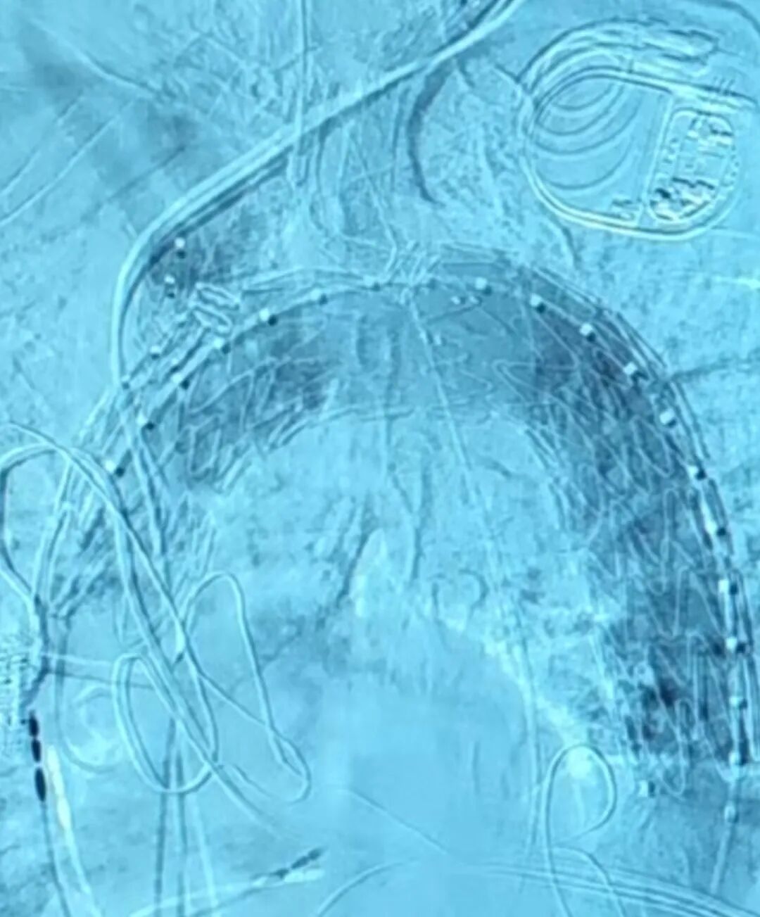 新加坡病例手术在陈笃生医院(Tan Tock Seng Hospital)由Glenn Tan教授及其团队实施。该患者诊断为主动脉弓动脉瘤,瘤体累及左锁骨下动脉,直径达6.7cm,常规腔内手术均无法安全重建全部分支血供。患者血管解剖结构复杂,左椎动脉迷走,腔内治疗需同时完成弓上四分支的重建,这使得治疗难度进一步增加。医生团队在与心脉医疗?团队充分沟通后,决定采用定制化四分支Hector?/通天戟?胸主多分支支架进行治疗。通过单次腔内介入,精准通过其一体式分支支架重建了无名动脉、内嵌通道重建左颈总动脉,通过预埋导管重建迷走左锥动脉和导丝超选重建左锁骨下动脉,完成了全球首例四分支Hector?/通天戟?胸主多分支支架植入手术。手术过程顺利,术中无并发症,术后血管造影结果优异,瘤体被有效隔绝。