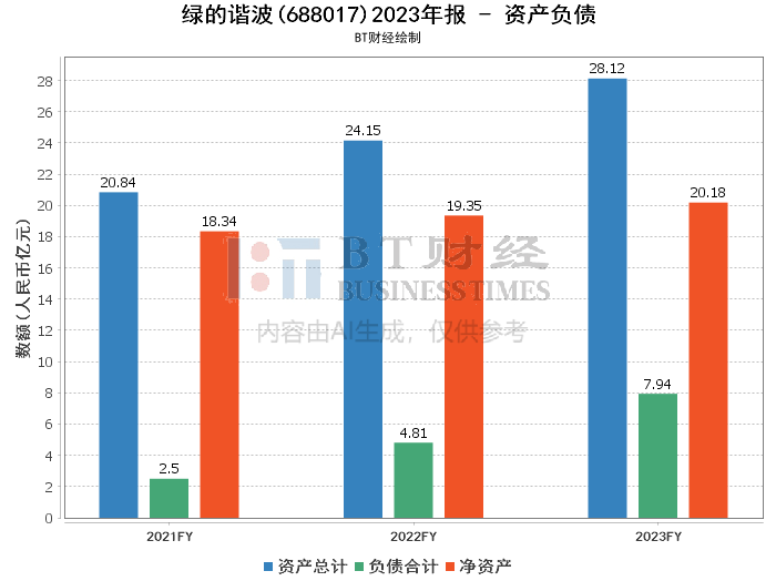 首先从资产负债数据来看,截至2023年末,绿的谐波总资产达到28.12亿元,较上年同期增长16.43%。这一增长主要得益于公司业务的稳健扩张。然而,值得关注的是,负债合计也相应增长至7.94亿元,同比增长率更是高达69.25%,这可能与公司加大研发投入、拓展市场等举措有关。尽管如此,公司的资产负债率仍保持在较为健康的28.25%水平,显示出较强的偿债能力。