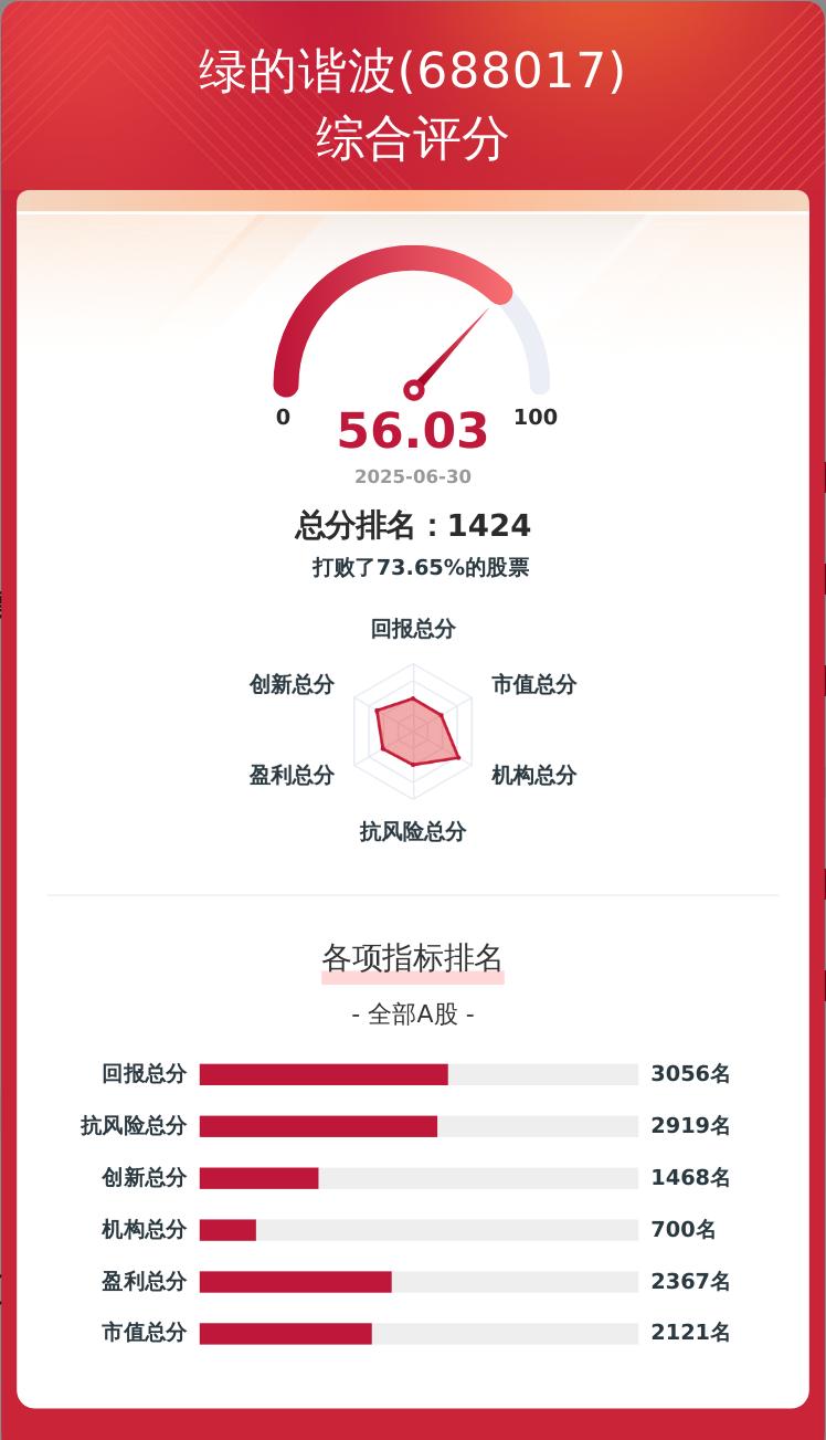 金融界上市公司研究院构建了一套上市公司韧性评价体系,从企业盈利、科技创新、股东回报、经营抗风险、市值表现及机构吸引力六个维度对企业进行量化评分,满分为100分。绿的谐波的韧性评价总分为56.03分,在A股5405家可比上市公司中排名第1424位。