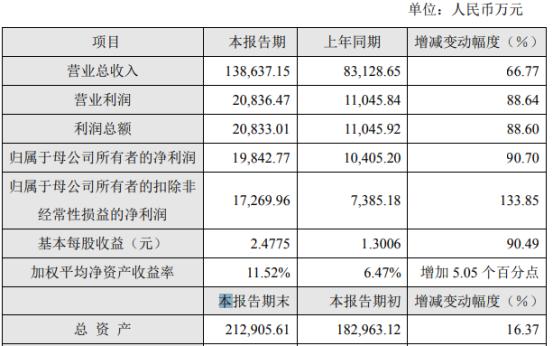 2021年度,公司实现营业收入138,637.15万元,同比增加66.77%;营业利润20,836.47万元,同比增加88.64%,利润总额20,833.01万元,同比增加88.60%;归属于母公司所有者的净利润19,842.77万元,同比增加90.70%。扣除结构性存款收益、政府补助等影响,报告期内实现归属于母公司所有者的扣除非经常性损益的净利润17,269.96万元,同比增加133.85%。
