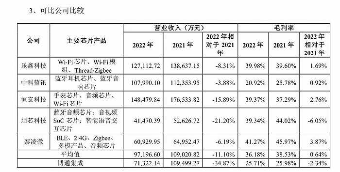 7月26日晚间,博通集成就上述问题回应上交所称,“同行公司中,主营Wi-Fi类产品的乐鑫科技于2022年销售Wi-Fi芯片0.88亿颗,同比2021年的1.46亿颗下降39.49%。公司2022年的Wi-Fi芯片销售量为0.84亿颗,同比2021年的1.59亿颗下降46.96%。乐鑫科技2022年收入下降幅度不大,主要系乐鑫科技的产品定位和收入构成与公司有所差异,乐鑫的收入构成中,除了芯片外,还包括模组产品(2021年和2022年,乐鑫的模组收入占比分别达到59%和67%),模组产品的单价与芯片相比较高,一定程度上平滑了销量下降对业绩的影响”。